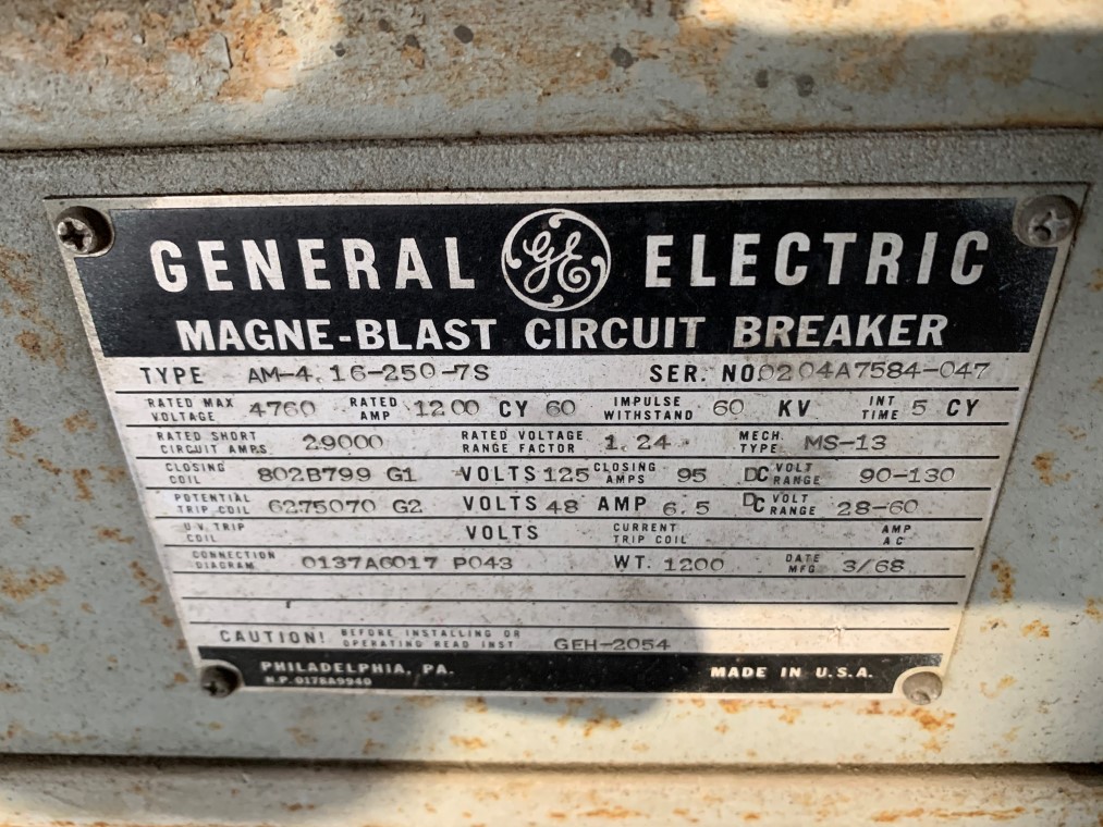 BKR191– GE AM-4.16-250-7S MagneBlastBreaker 1200A 4160V EO/DO 48/125VDC Control