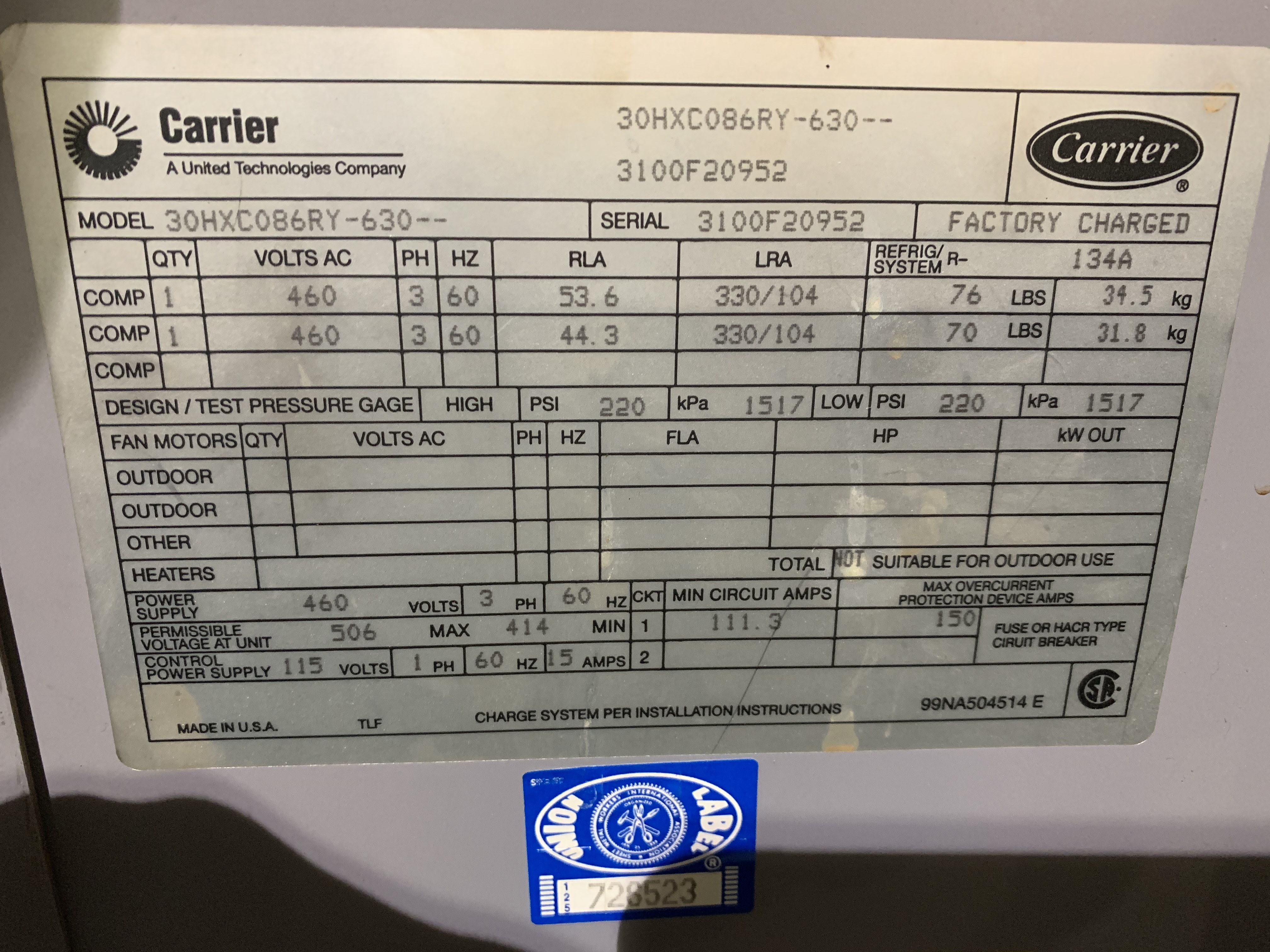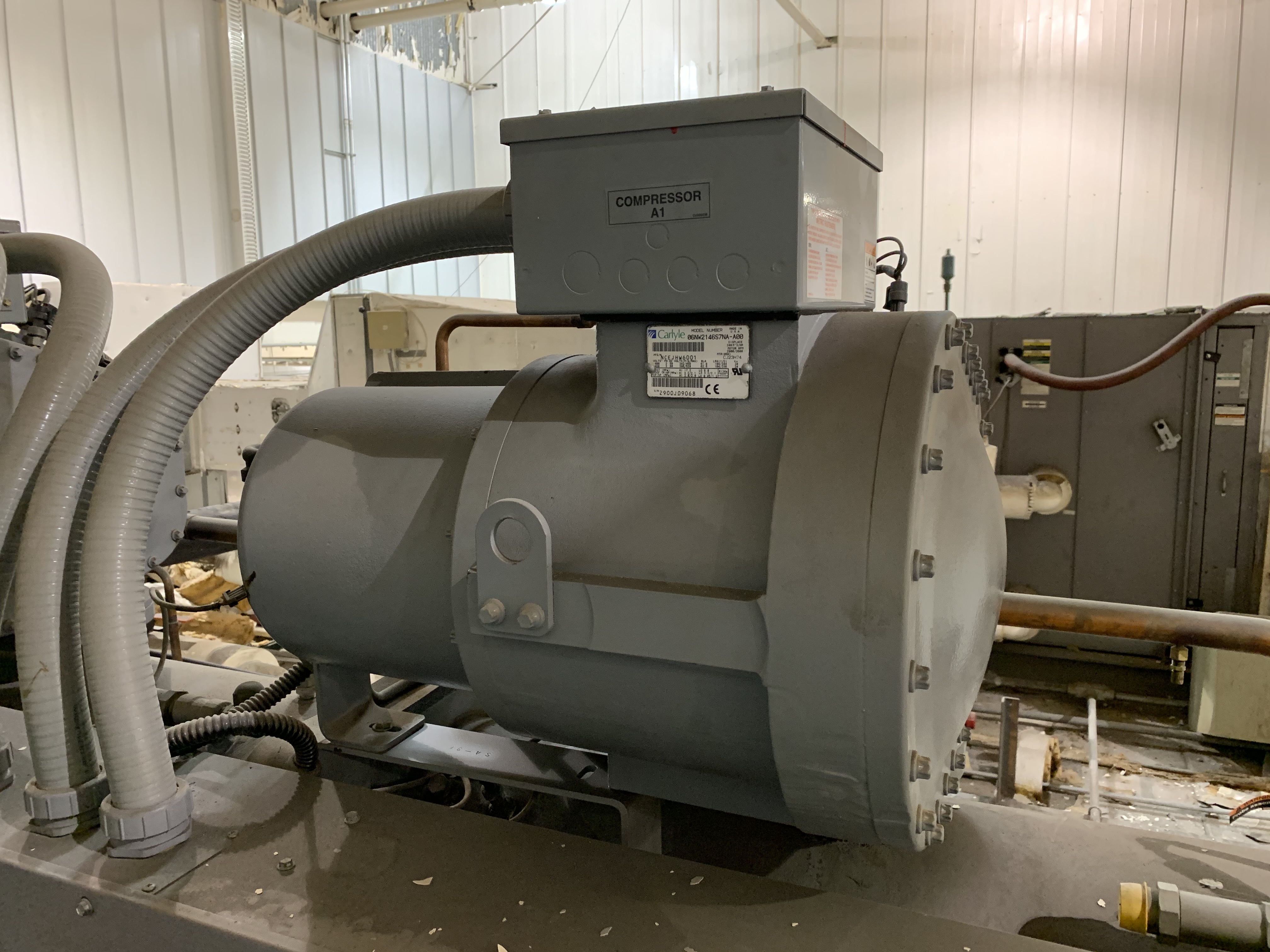 Carrier Ecologic Chiller; Water cooled screw chiller 30HXC086RY-630 nominal tonnage of 86 tons; HFC-134A