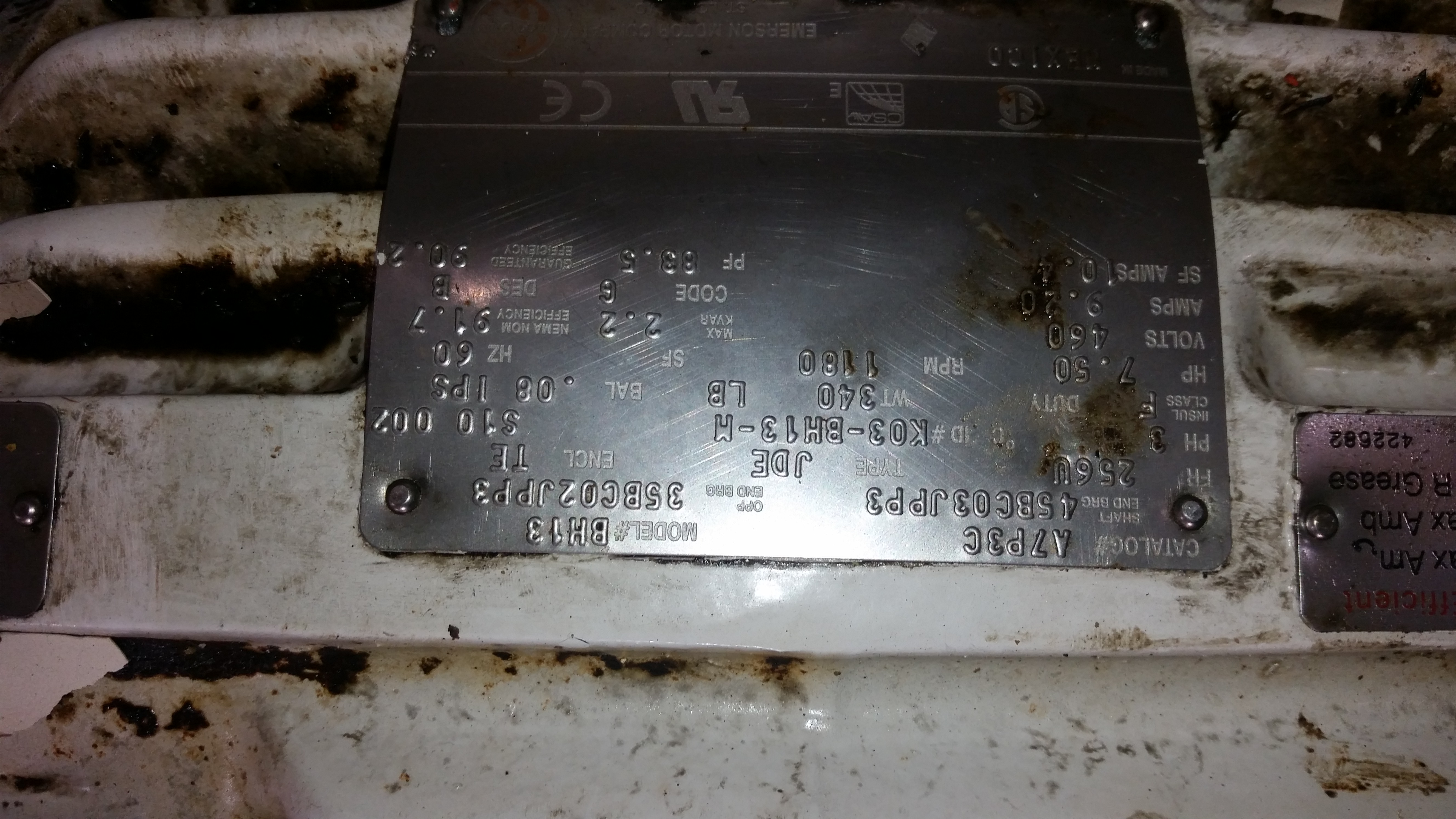 Used Emerson Motor 7.5HP; 1180RPM; 460V; Frame: 256U K03-BH13-M for sale.