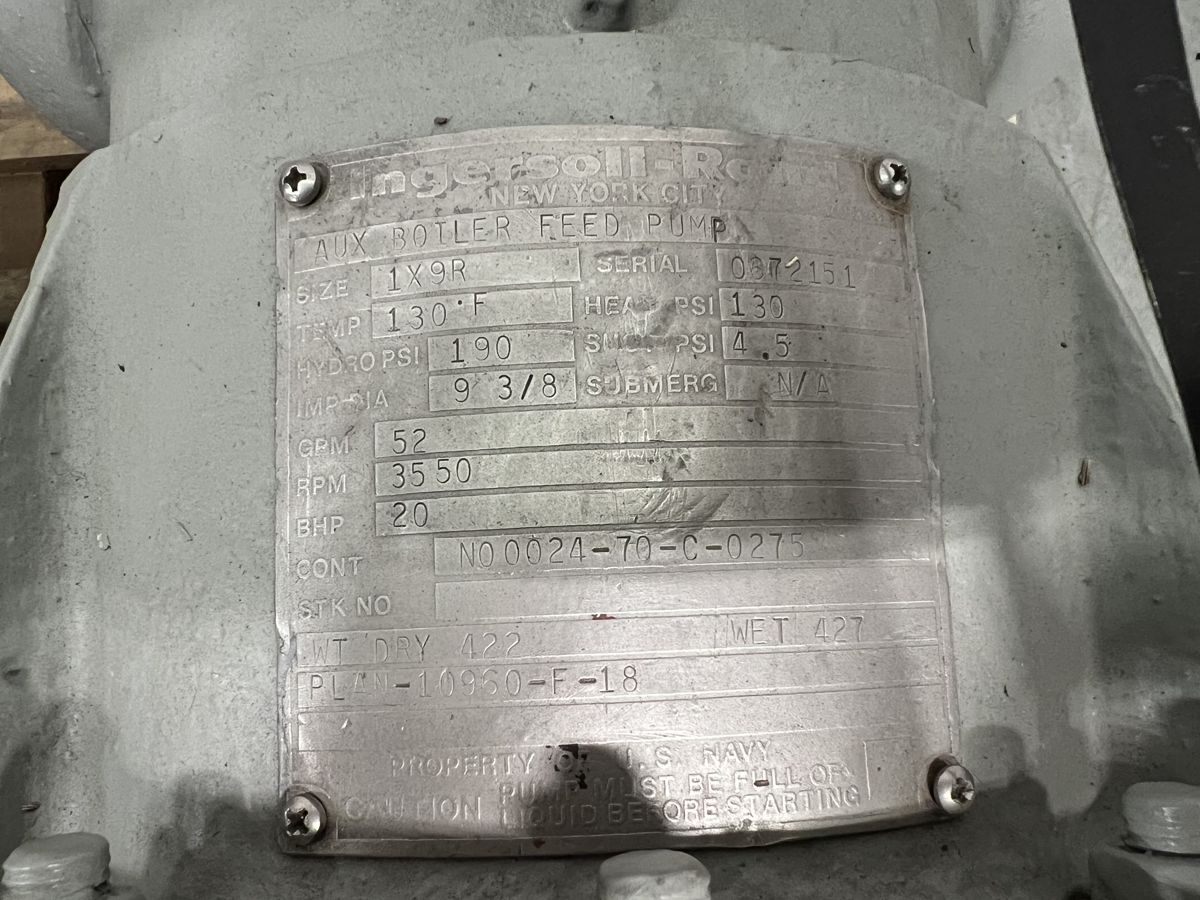 Pump: 3550 RPM, 52 GPM, 130 Head PSI, 190 Hydro PSI