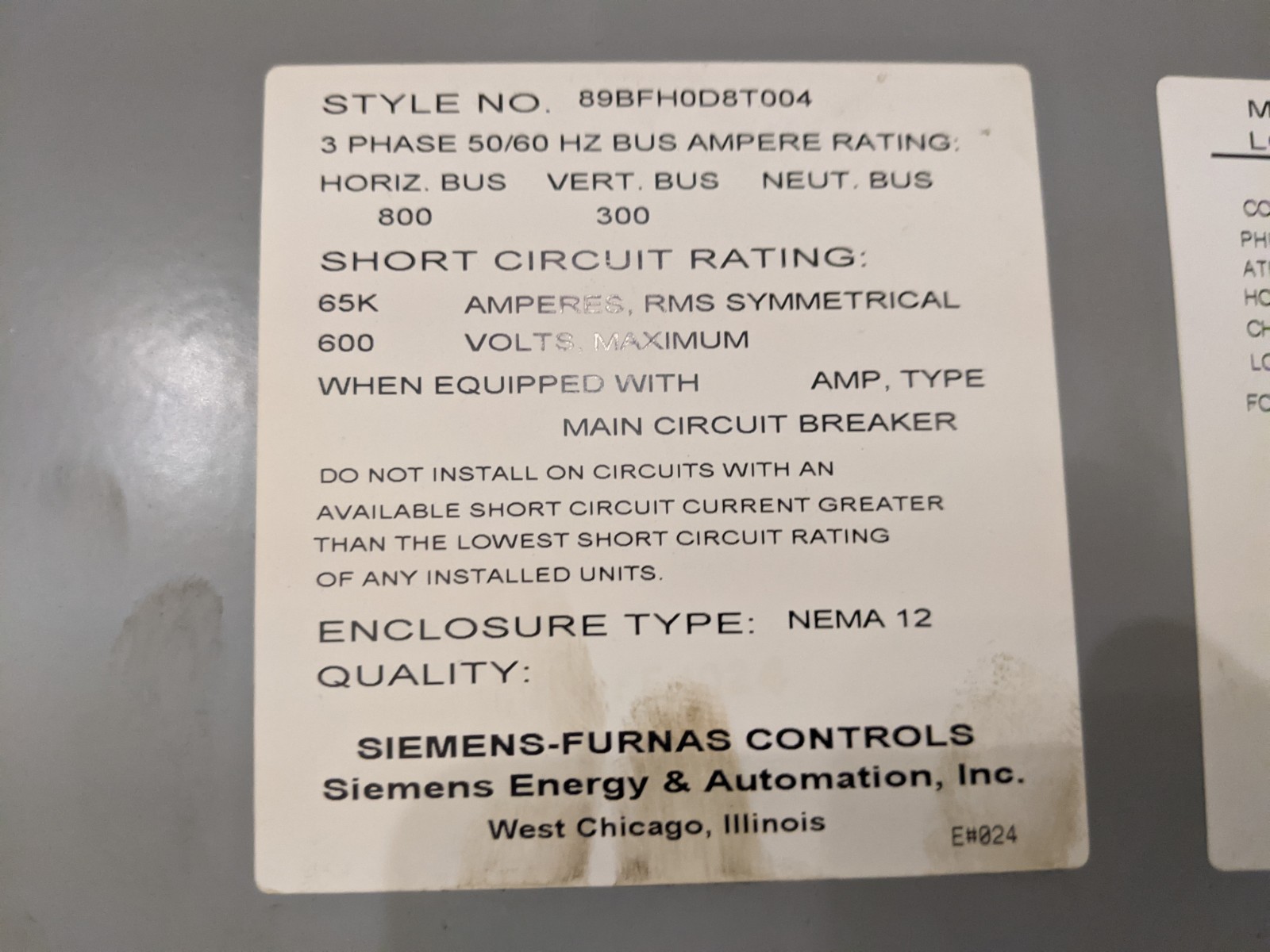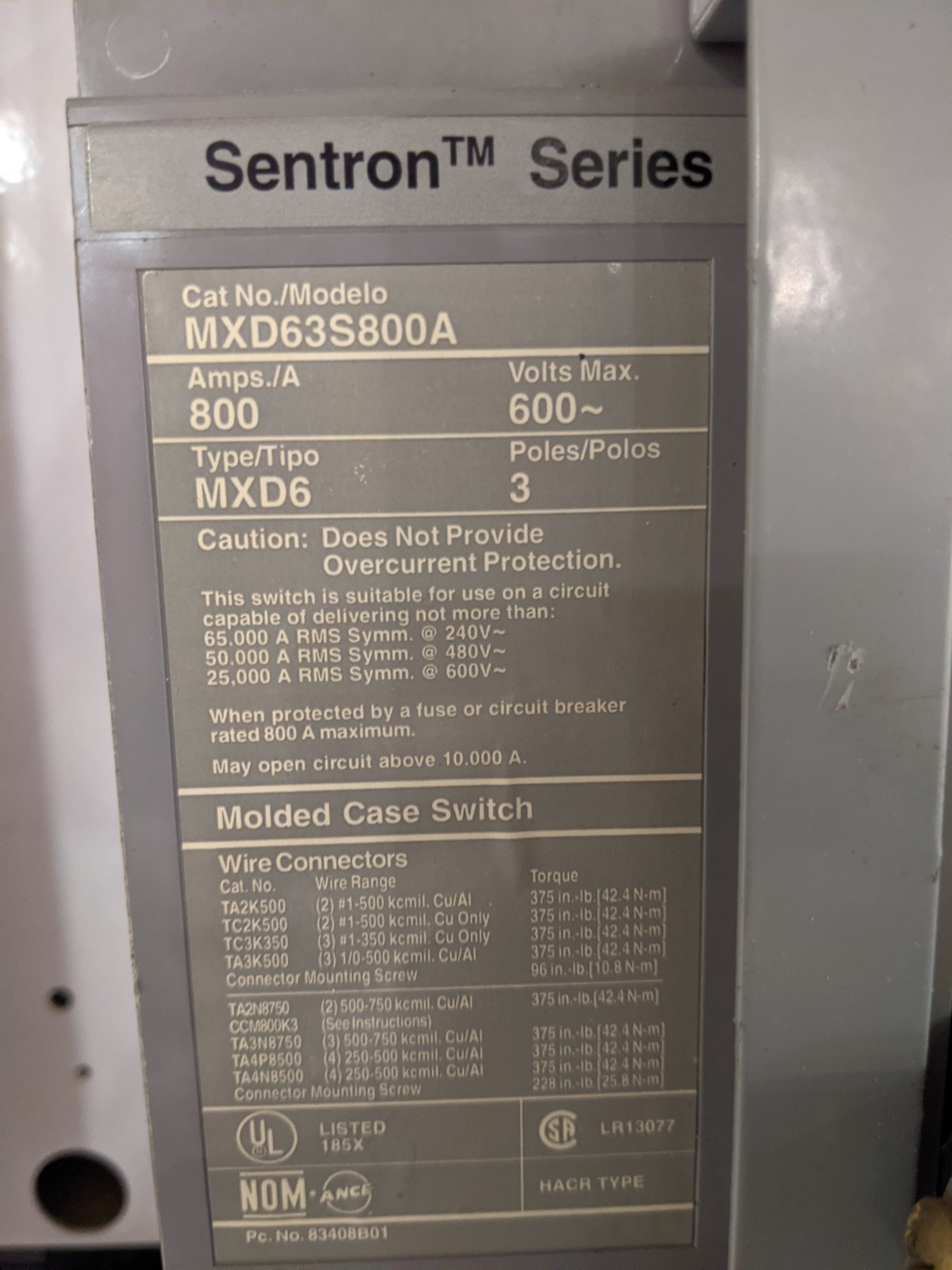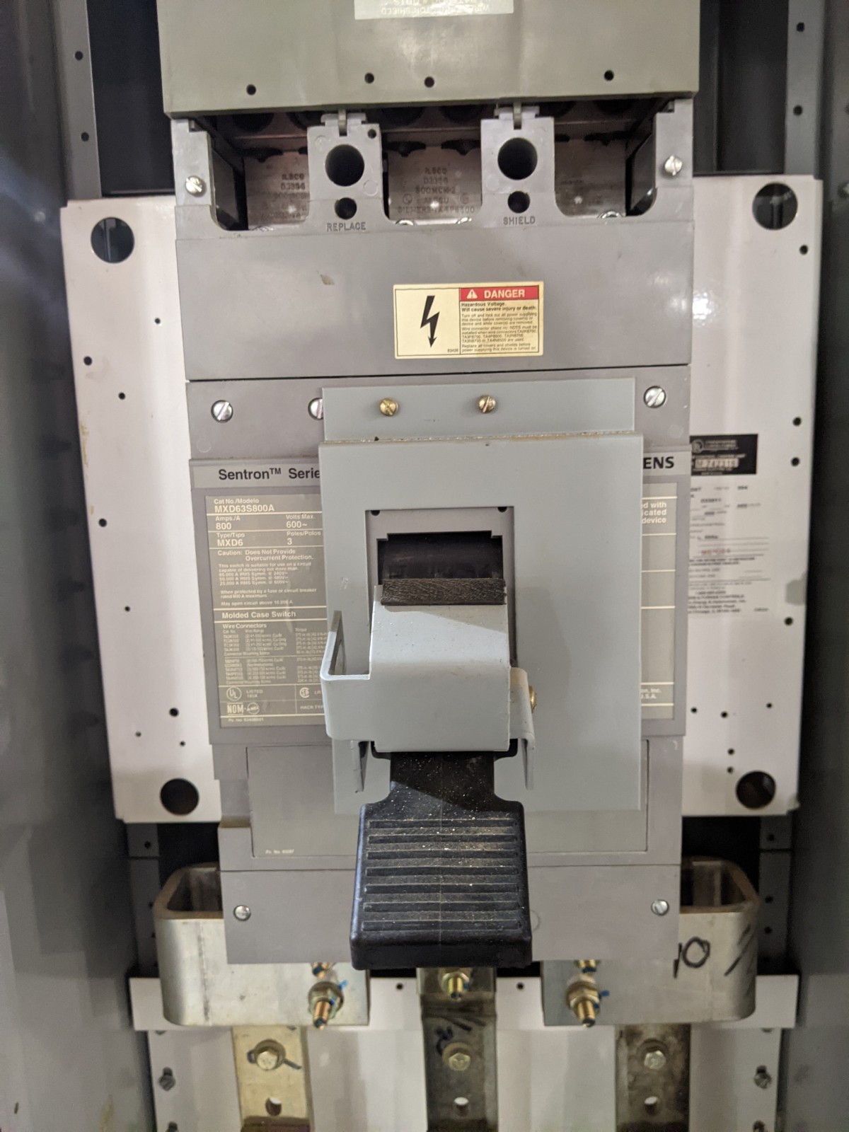 Main Breaker: Siemens 800 Amp 600V 3 Pole Molded Case Circuit Breaker